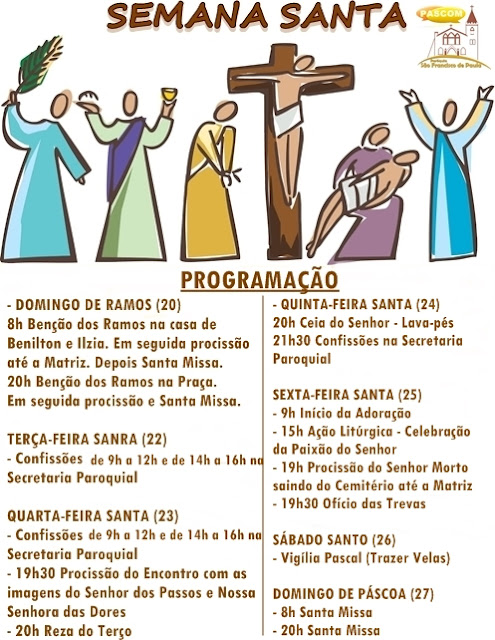 A Semana Santa começa com o Domingo de Ramos, no próximo domingo, 20/03, e prossegue recordando a Paixão, Morte e Ressurreição de Nosso Senhor Jesus Cristo.