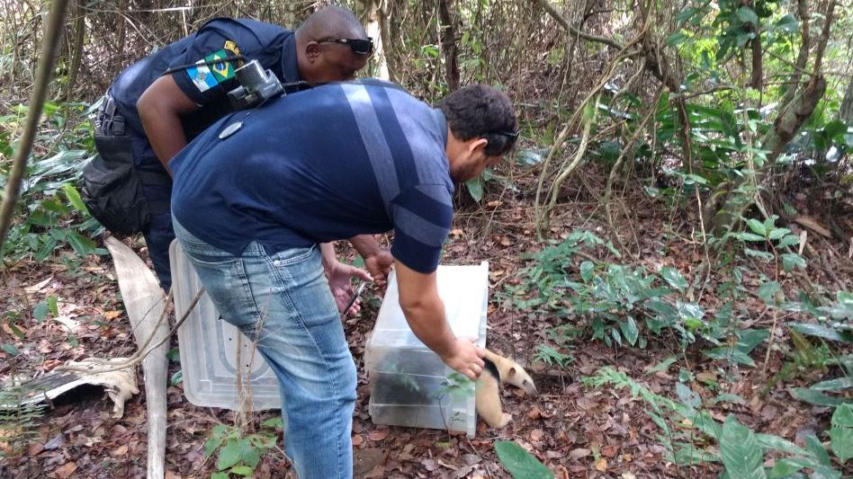 Após o resgate, o bicho foi solto da Estação Ecológica de Guaxindiba. O Tamanduá Mirim também é conhecido como Tamanduá de Colete ou Tamanduá de Coleira.