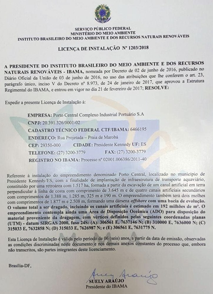A licença de instalação do Porto Central em Presidente Kennedy, no Sul do Espírito Santo, foi liberada pelo Ibama nesta quinta-feira, 1º. (Veja documento ao final desta postagem). A obra deve envolver um investimento de mais de R$ 3 bilhões com contratação de 4,7 mil pessoas.