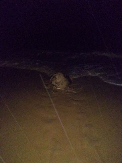 A tartaruga aparentava estar bem, porém sem rumo. Com se tratava de um animal adulto e muito pesado, os guardas fizeram uma tentativa de, usando o farol da viatura, iluminar um caminho mais fácil para a tartaruga voltar para o mar.