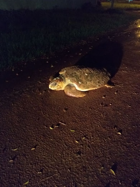 Uma tartaruga desorientada, andando por um rua da Praia de Guaxindiba, em São Francisco de Itabapoana, foi devolvida ao mar numa ação entre moradores e a Guarda Civil Municipal, na noite deste sábado, 10.