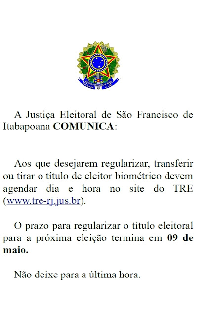 Em comunicado enviado ao Site VNOTÍCIA (veja ao final da postagem), a Justiça Eleitoral de São Francisco de Itabapoana (SFI) informa como os eleitores devem fazer para tirar o título de eleitor com a intenção de voltar nas eleições de 2018. O prazo estipulado pela Justiça Eleitoral vai até o dia 9 de maio. A data vale também para aqueles que precisam transferir o domicílio, alterar dados do seu cadastro, solicitar mudança para uma seção de fácil acesso ou regularizar o título cancelado.