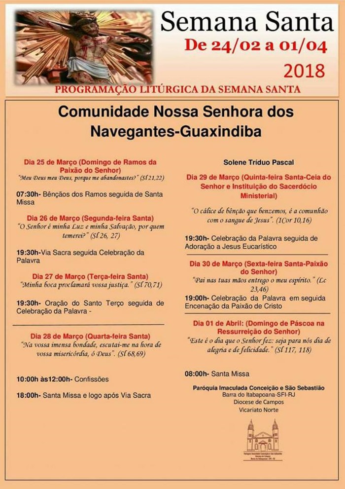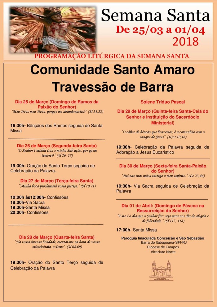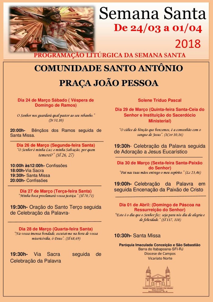 A Sexta-feira Santa, feriado nacional, dia que a crucificação de Jesus Cristo e sua morte no Calvário é lembrada pelos cristãos em todo mundo, em São Francisco de Itabapoana haverá uma vasta programação nas igrejas que compõe as Paróquias São Francisco de Paula, no Centro, e Imaculada Conceição e São Sebastião, em Barra do Itabapoana.