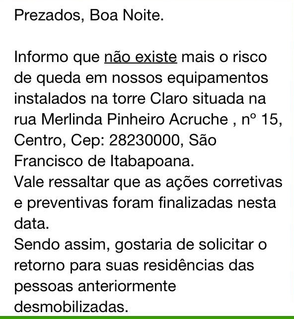 A empresa Claro concluiu o reparo da torre de telefonia móvel na Rua Melinda Pinheiro Acruche, no Centro de São Francisco de Itabapoana. Com isso, moradores e comerciantes voltam na manhã desta quarta-feira, 06/04, para suas casas e lojas. Eles deixaram seus imóveis por determinação da Defesa Civil na última quinta-feira, 31-03.