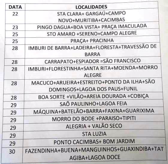 “Neste primeiro dia, a nossa equipe estará nas localidades de Santa Clara, Gargaú, Campo Novo, Muritiba e Cacimbas. Na quarta-feira (23) será a vez de Pingo D’Água, Boa Vista e Praça Imaculada. Já na sexta-feira (25), serão atendidos os criadores de Santo Amaro, Sereno, Campo Alegre, Praça e Pracinha”, informou o secretário da pasta, Matheus Henriques (confira o cronograma completo da vacinação no final da matéria).