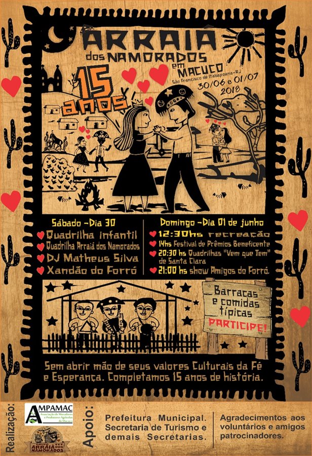 O Grupo Arraia Dos Namorados e a Ampamac - Associação de Moradores e Produtores Agrícola de Macuco, promove neste fim de semana, dias 30 de junho e 01 de julho, o 15º Arraia dos Namorados, no bairro do Macuco, próximo ao Centro de São Francisco de Itabapoana.