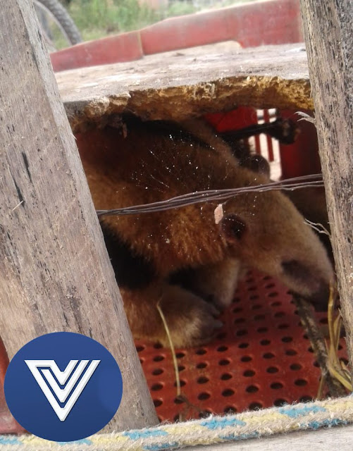 Os moradores providenciaram uma caixa e prenderam o animal silvestre até a chagada do resgate. No momento em que a foto acima foi tirada, um morador tentava se aproximar do tamanduá para prendê-lo. Nesse momento, se sentindo ameaçado, o bicho “se armou” e ficou numa posição diferente da habitual.
