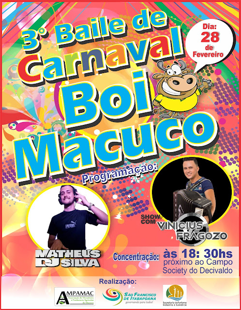 Nesta quinta-feira, 28, a Ampamac – Associação de Moradores e Produtores Agrícolas do Macuco, realiza seu Terceiro Baile de Carnaval, com a presença do famoso Boi Pintadinho Macuco e outros personagens ícones dos carnavais de rua. Durante o evento, serão entoadas as melhores marchinhas e músicas de carnaval, por conta do DJ Matheus Silva e o Cantor Vinicius Fragoso.