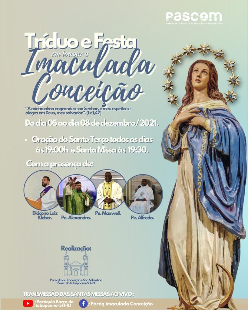 A paróquia de Barra do Itabaoana divulgou a programação do tríduo e festa em louvor a Imaculada Conceição, Co-padroeira da região. O evento acontecerá entre os dias 05 de dezembro e 08 de dezembro, na igreja matriz, em Barra do Itabapoana.